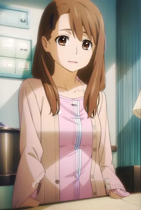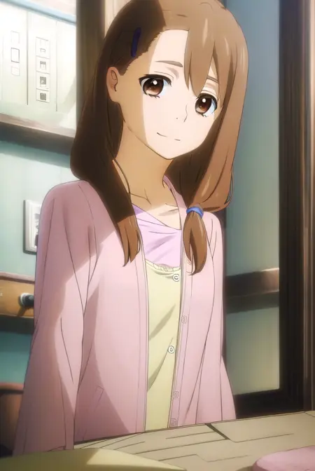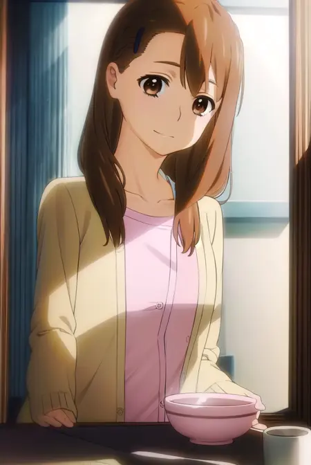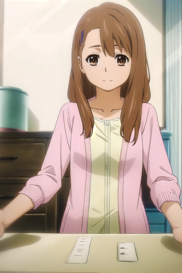 touko yadomi, long hair, brown hair, (brown eyes:1.7), hair over shoulder, hair clip,