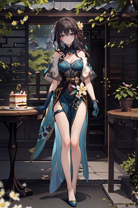 Additional prompts for default costume (Version 3 and above): chinese hairpin, pearl necklace, detached mandarin collar, capelet, strapless china dress, teal elbow gloves, thigh strap, teal pumps