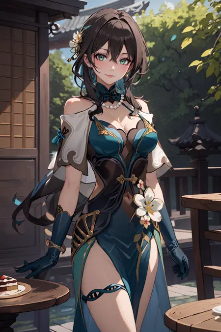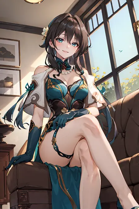 Additional prompts for default costume: china dress, green gloves, hair ornament, pumps, detached collar, necklace, capelet, thigh strap