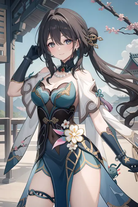 Additional prompts for default costume (Version 3 and above): chinese hairpin, pearl necklace, detached mandarin collar, capelet, strapless china dress, teal elbow gloves, thigh strap, teal pumps