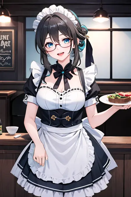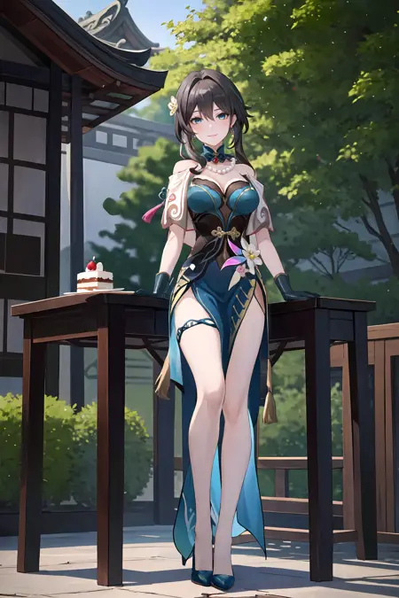 Additional prompts for default costume (Version 3 and above): chinese hairpin, pearl necklace, detached mandarin collar, capelet, strapless china dress, teal elbow gloves, thigh strap, teal pumps