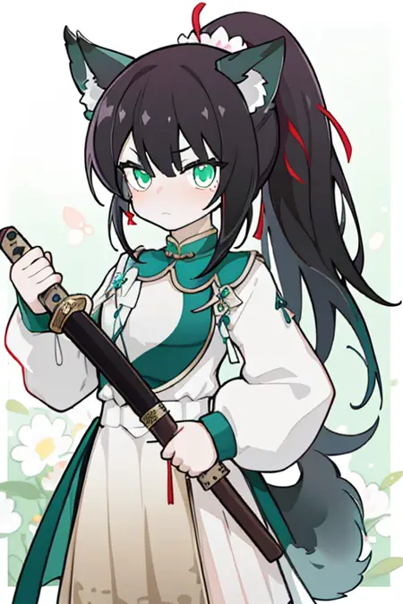 人形(human):xialuling, 1girl, solo, long hair, green eyes, ponytail, hair ornament, black background, hair flower, long sleeves, looking at viewer, flower, red ribbon, puffy long sleeves, simple background, hand on hip, skirt, ribbon, bangs, black hair, blush, hair ribbon, white flower, closed mouth, hair between eyes, shirt, puffy sleeves, very long hair,