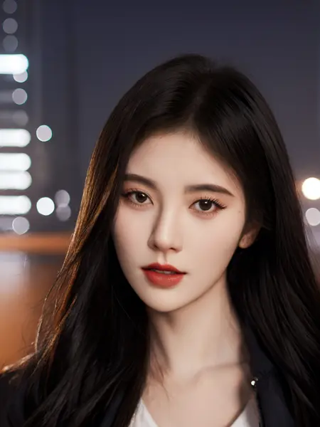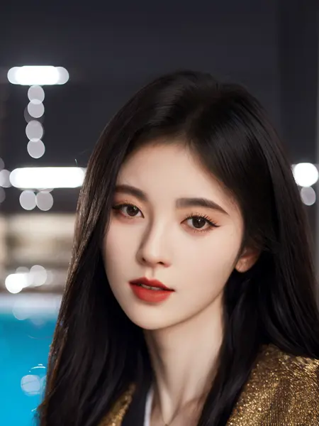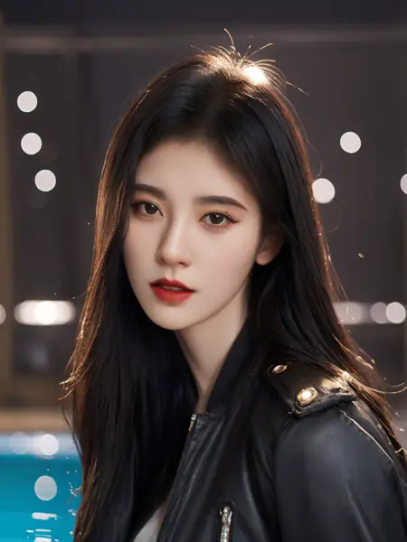 - JJYface,1girl, solo, realistic,looking at viewer,lips,long hair, cityscape, night, mature female,pool, jacket, (smile:0.6),portrait,