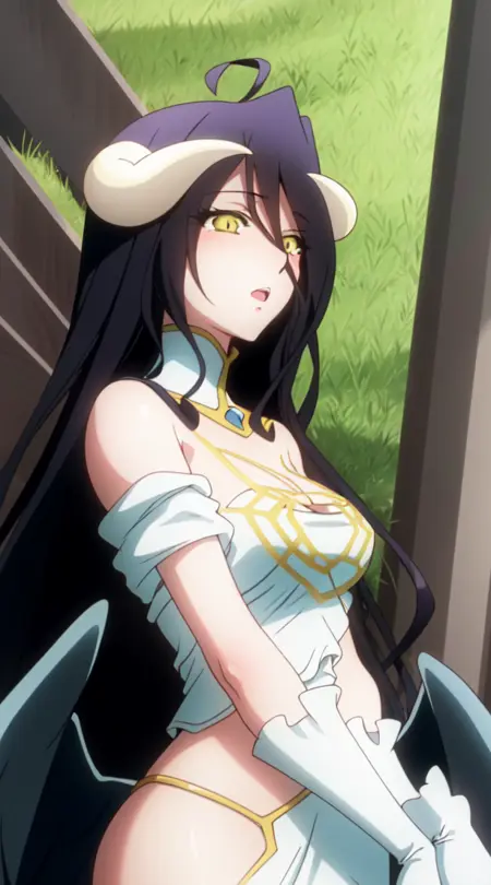 阿尔贝多,1girl,albedo (overlord),独女,长发,角,黑发,手套,翅膀,呆毛,白手套,黄眼,连衣裙,脸红,恶魔少女,恶魔角,露肩,黑翼,极长发