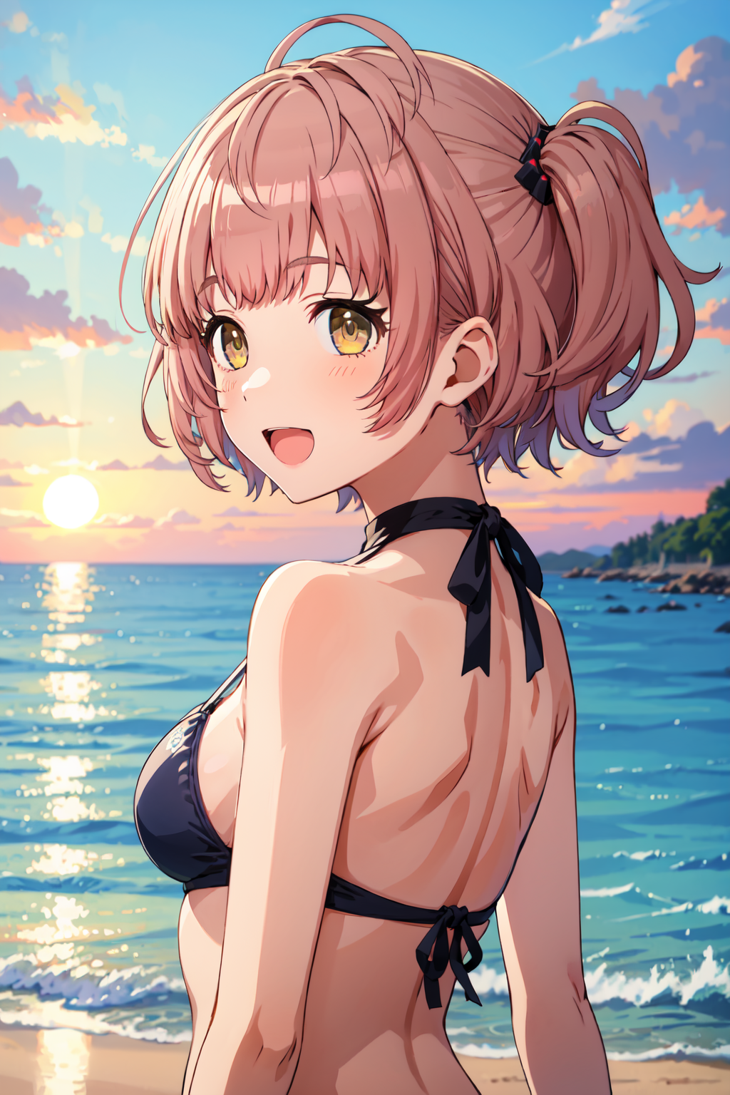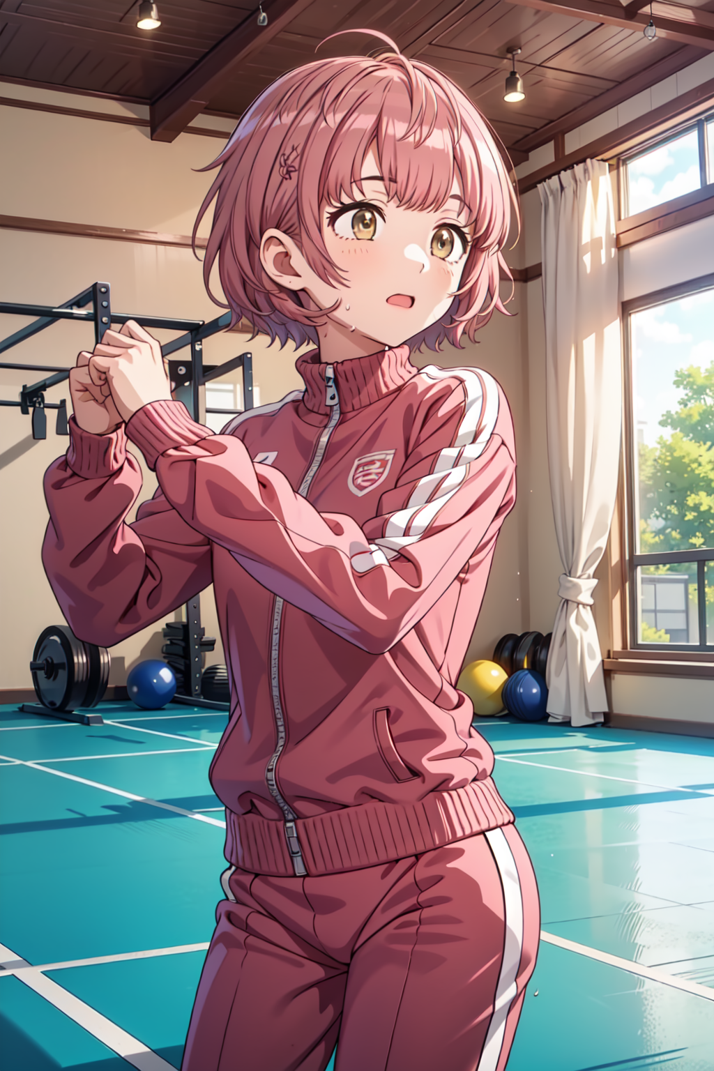 h_ikuta, 1girl, short hair, pink hair, brown hair, yellow eyes