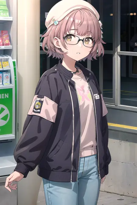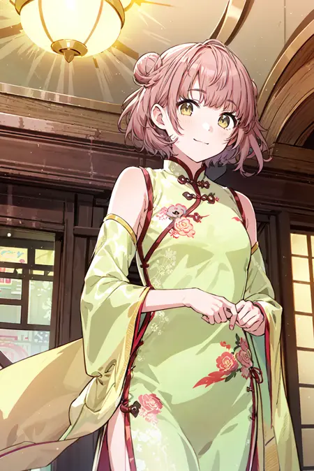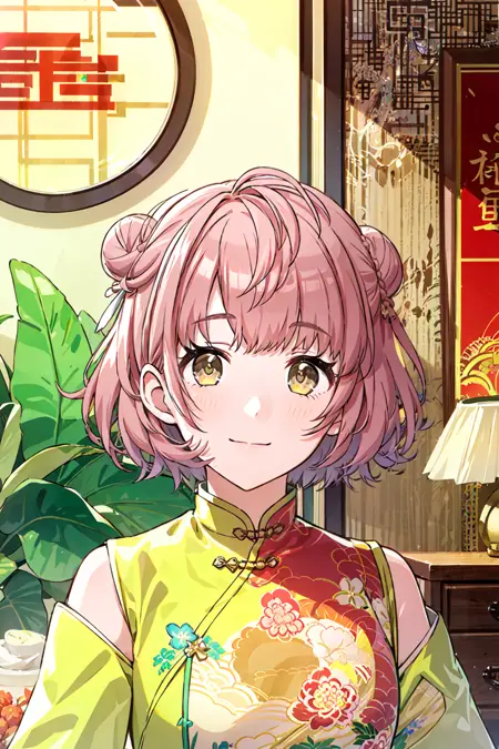 h_ikuta, 1girl, short hair, pink hair, brown hair, yellow eyes