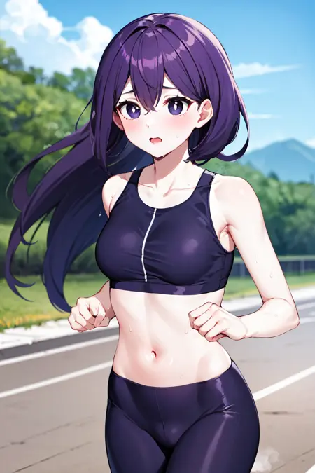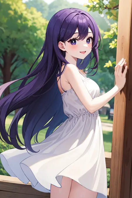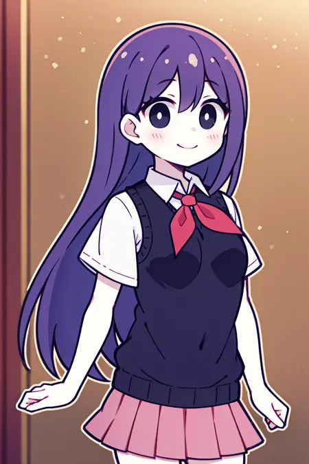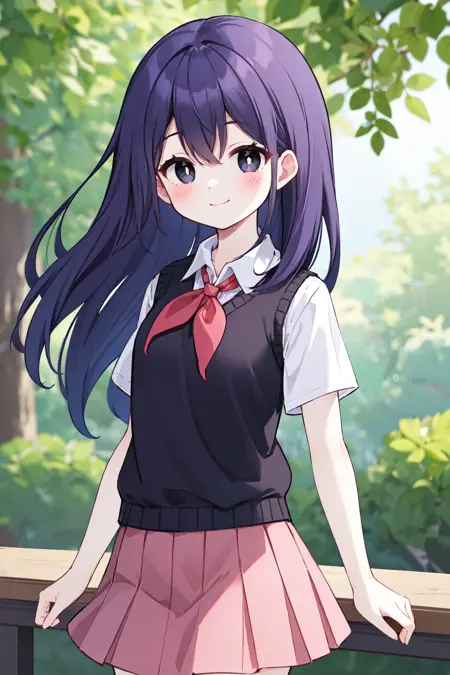 服装1(紫发 ↔ 黑发)1girl, solo, long hair, purple hair, bangs, black eyes, bright pupils, white pupils, white skin, school uniform, red neckerchief, white shirt, sweater vest, black sweater, short sleeves, pleated skirt, pink skirt