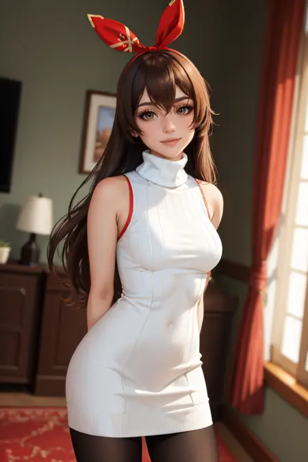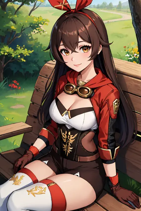 Default Outfit: amberdef, hair ribbon, goggles on head, shrug \(clothing\), long sleeves, brown gloves, short shorts, red thighhighs, cleavage