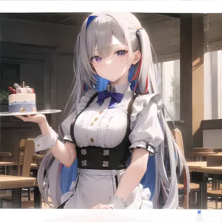 최고의 품질, 걸작, 가나타 아마네, 짧은 머리카락, 다색 머리카락, 회색 머리카락, 색상 처리된 안쪽 머리카락, (파란 머리), 보라색 눈, lora:amane_kanata:0.7