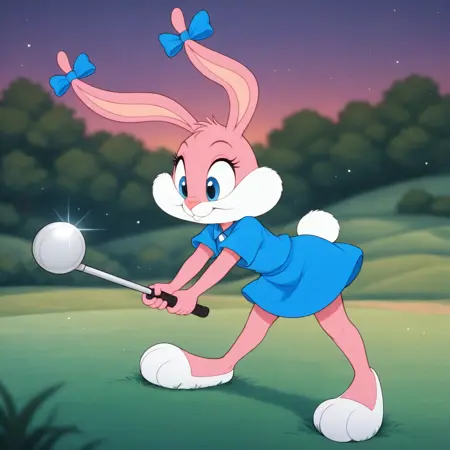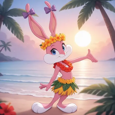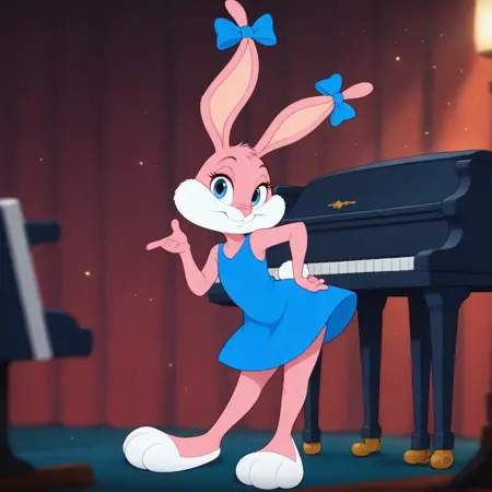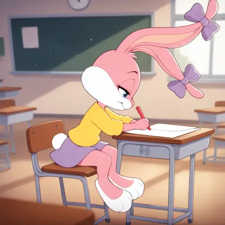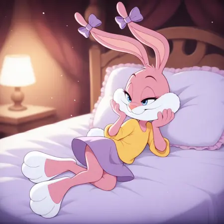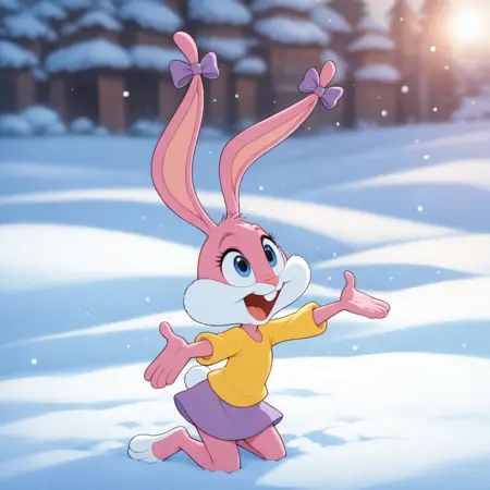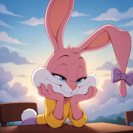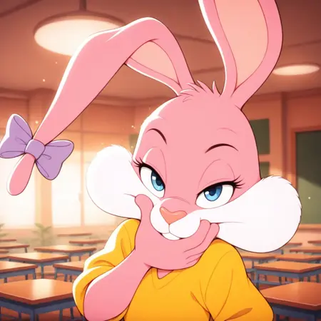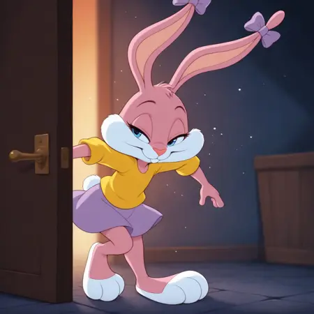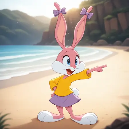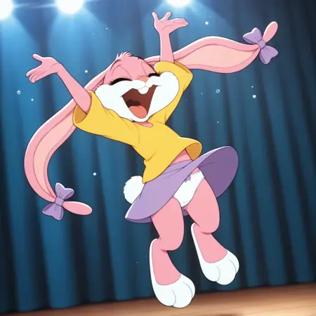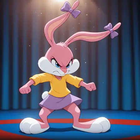 Standard Tag: Babs, bunny, girl, blue eyes, mouth open, Pink eyelids, rabbit teeth, pink nose, pink body, pink head, pink ears, pink legs, white cheeks, white feet, white tail, erect ears, yellow T-shirt, purple skirt, purple bows on the ears