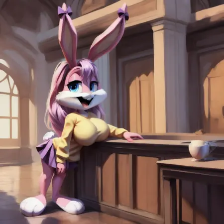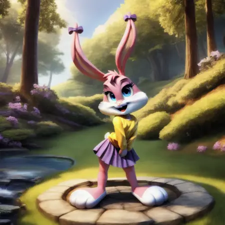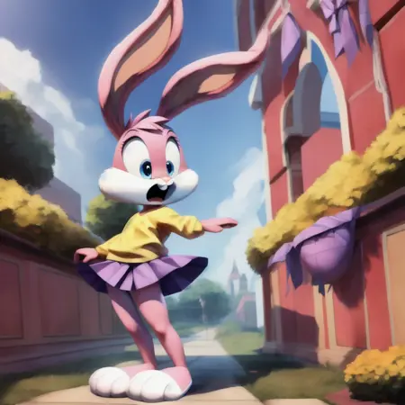 professional 3d model lora:BabsBunny\_v8.1:0.8, lora:Furtastic\_Detailer:0.7, cute eyes, Cute, playful, teasing, sexy, curvy, slender, naughty, Babs, bunny, girl, blue eyes, mouth open, rabbit teeth, pink nose, pink body, pink head, pink ears, pink legs, white cheeks, white feet, erect ears, white tail, yellow T-shirt, purple skirt, purple bows on the ears, looks up, standing, modest, naive, young, Small body, dwarf, legs without knee