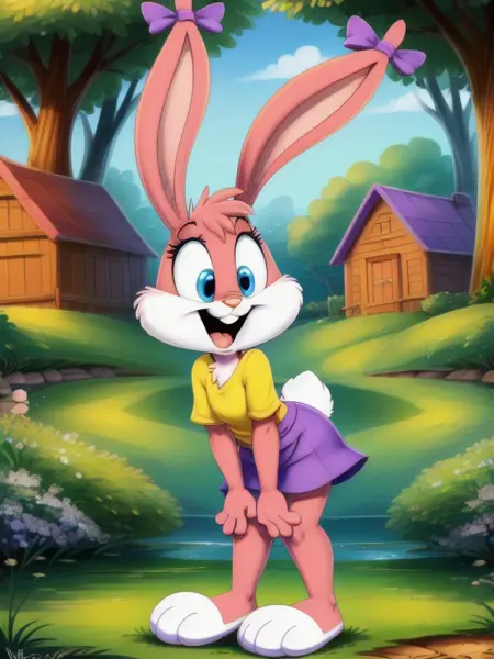 Standard Tag: Babs, bunny, girl, blue eyes, mouth open, Pink eyelids, rabbit teeth, pink nose, pink body, pink head, pink ears, pink legs, white cheeks, white feet, white tail, erect ears, yellow T-shirt, purple skirt, purple bows on the ears