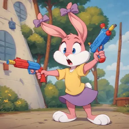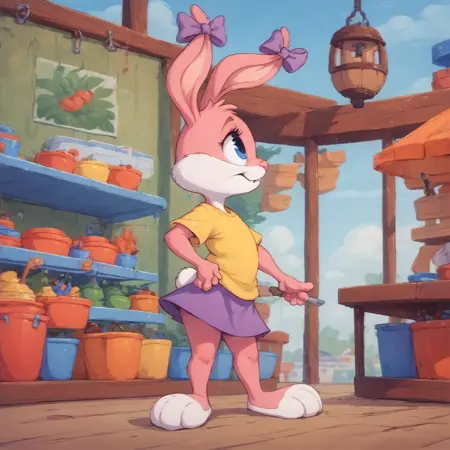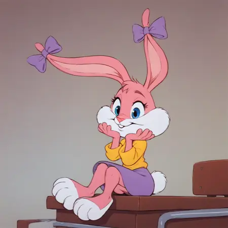 Standard Tag: Babs, bunny, girl, blue eyes, mouth open, Pink eyelids, rabbit teeth, pink nose, pink body, pink head, pink ears, pink legs, white cheeks, white feet, white tail, erect ears, yellow T-shirt, purple skirt, purple bows on the ears