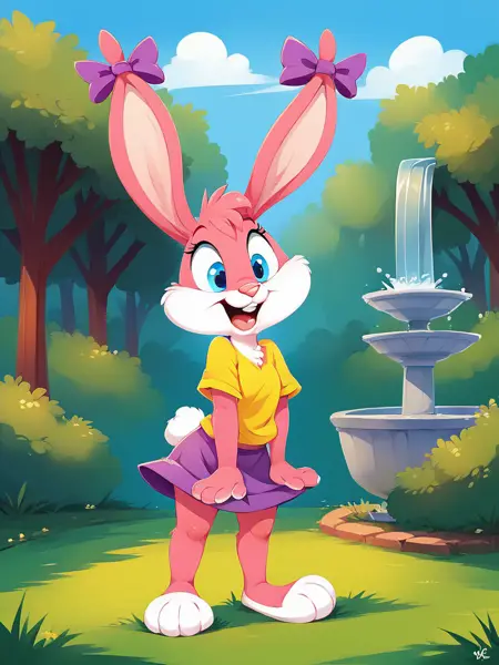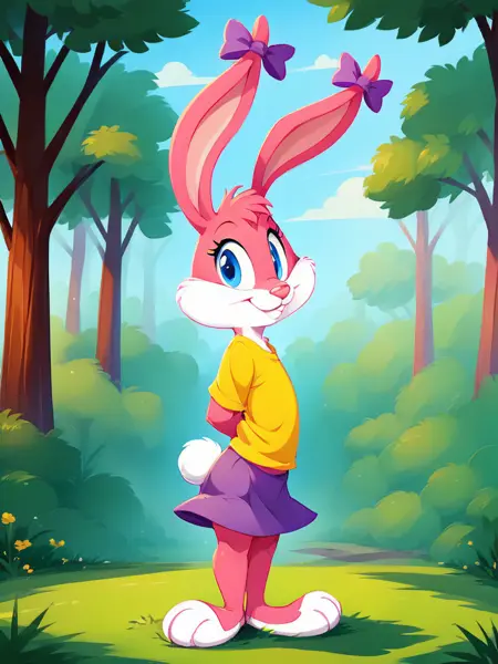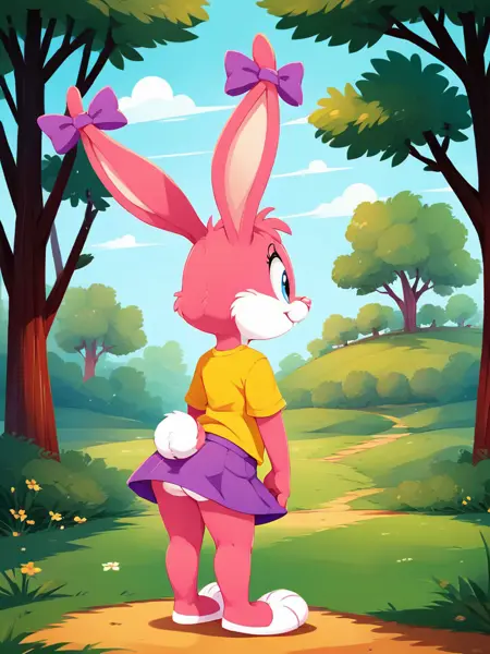 professional 3d model lora:BabsBunny_v8.1:0.8, lora:Furtastic_Detailer:0.7, 귀여운 눈, 귀여움, 장난스러움, 놀림, 섹시함, 곡선, 날씬함, 장난스러움, 바브, 토끼, 소녀, 파란 눈, 입 벌린, 토끼 이빨, 분홍색 코, 분홍색 몸, 분홍색 머리, 분홍색 귀, 분홍색 다리, 흰색 볼, 흰색 발, 세운 귀, 흰색 꼬리, 노란 티셔츠, 보라색 치마, 귀에 보라색 리본, 위를 보는, 서 있는, 검소한, 순진한, 어린, 작은 몸, 왜소, 무릎 없는 다리