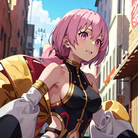 Use the keywords "bare shoulders" and/or "detached sleeves" for resemblance of her outfit as a Pillar.