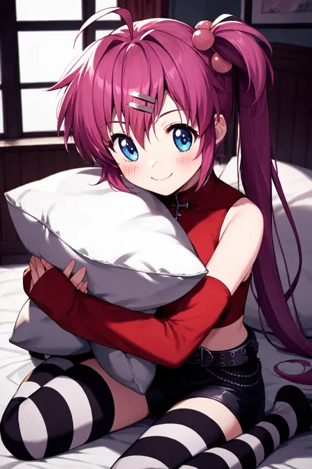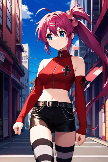 red crop top, red sleeves, exposed shoulders, black miniskirt, studded belt