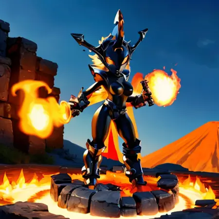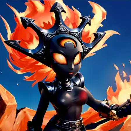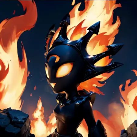 1girl, solo, Smolderdash, 中等胸部, colored sin, 火焰, 黑色皮肤, 头盔,