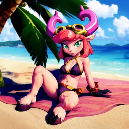 1girl、Splat、ピンクの髪、緑の目、頭にゴーグル、フューリーな女性、毛皮の体、色付きの毛皮、ピンクの毛皮、動物の耳、動物の鼻、ヤギの尾、角