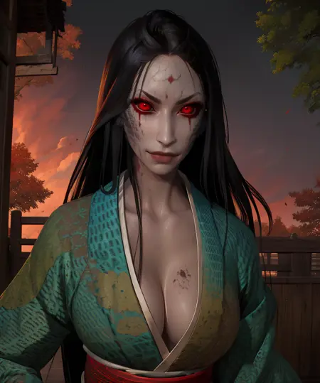 green kimono,dirty, wide sleeves, - red sash, - pelvic curtain,