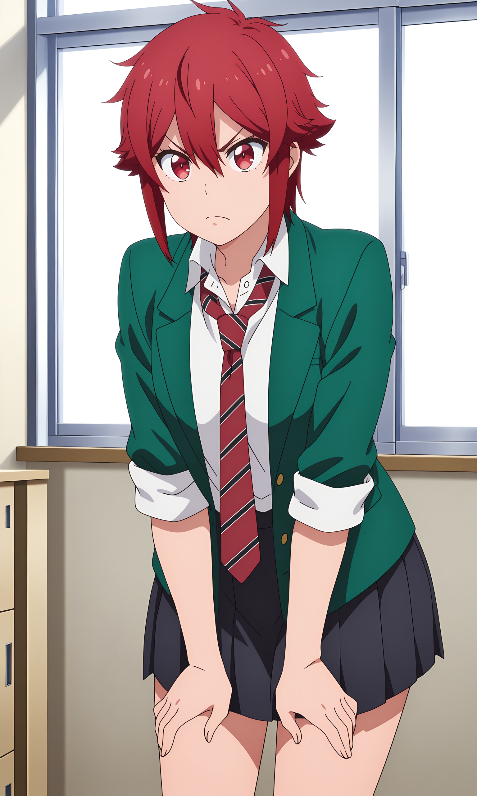 school uniform, shorts, green jacket, white shirt, necktie,