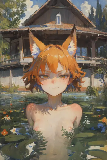 結果として、水彩画のような感じでもなければ、油絵のような感じでもありません。奇妙なパステル状のねっとりとした混合スタイルです。適切なキーワードを使えば印象派に強く傾くこともできますが、その本質的なスタイルは非常に柔らかい線、曖昧で不規則なタッチ、軽い筆致と柔らかい照明にあります。