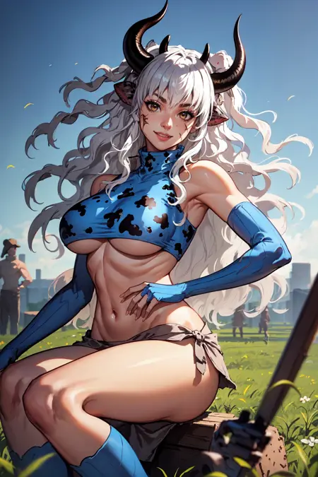 Trigger: "KingUma, brown eyes, cow girl, horns, long hair" always needed, "large breasts, toned, abs" suggested for accuracy. Optionally use "Scar on cheek" but it isn't consistent due to the data.