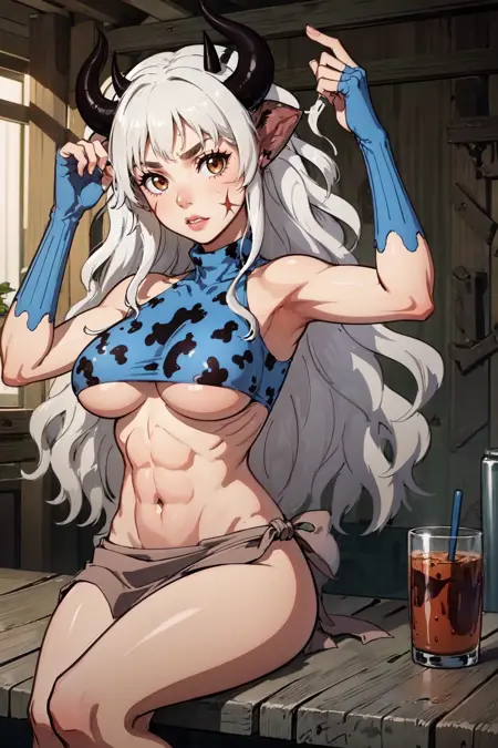 Cow girl + abs = good time. A fun little lora to make but it turned out decently given there was barely 20imgs of somewhat inconsistent data like horns being a different lengths but, with some editing, I got them somewhat more consistent. I hope you all enjoy.