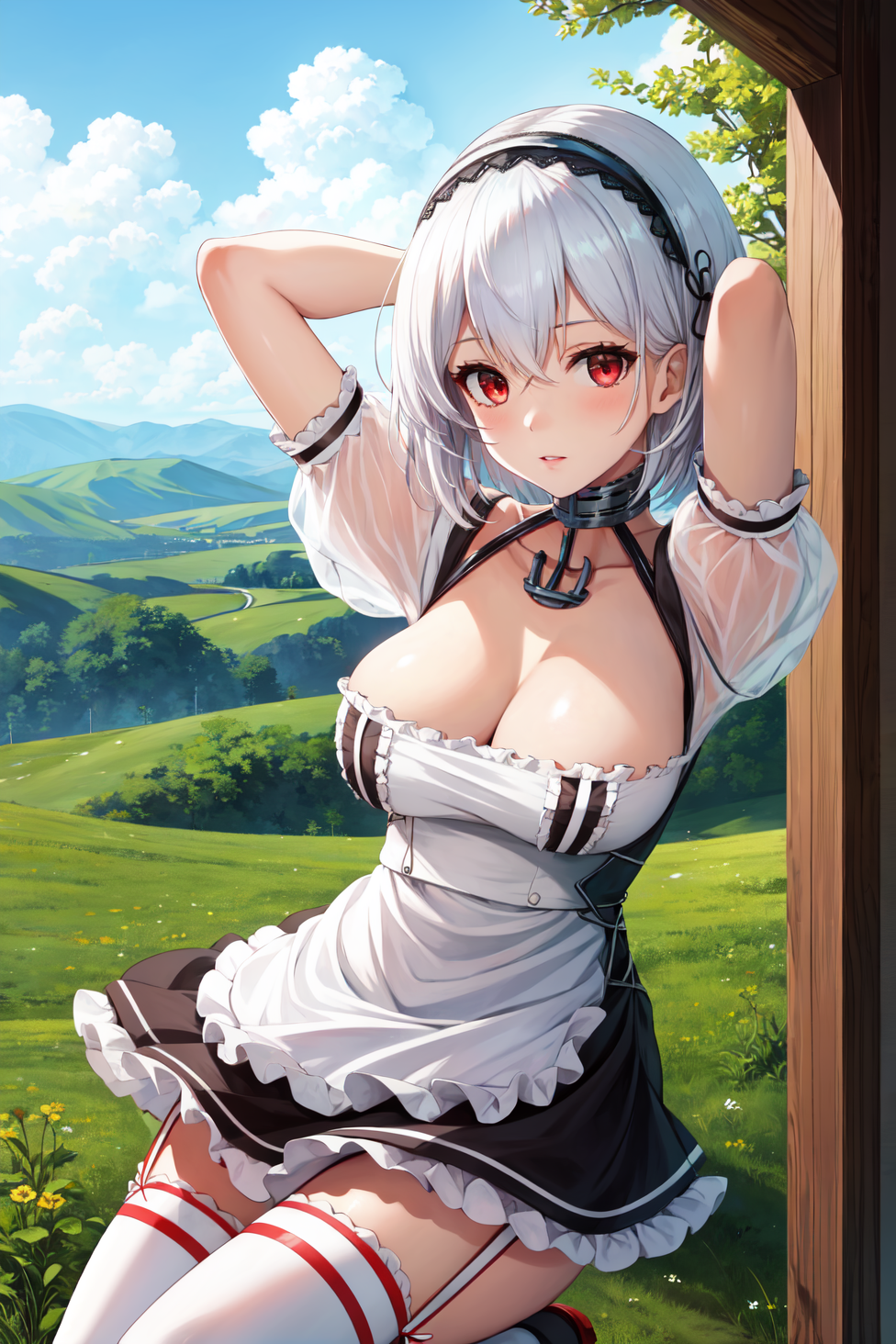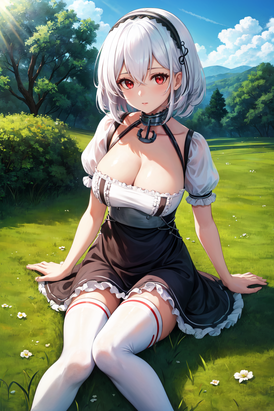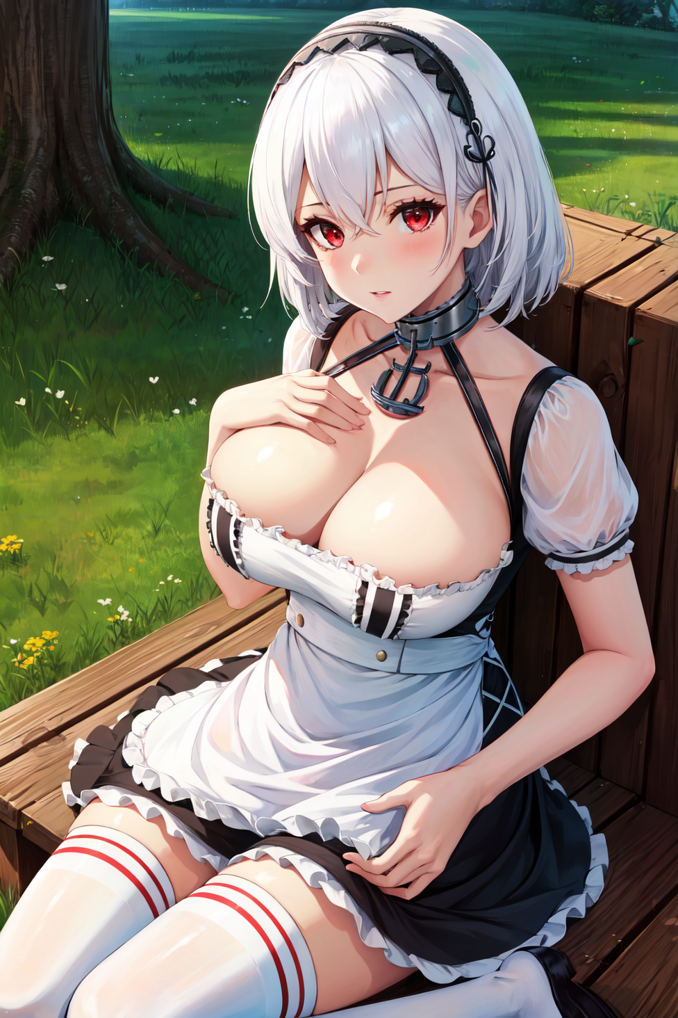 赤い目、白い髪、短い髪、前髪、大きい胸、目の中の髪、ヘアバンド、レース縁のヘアバンド、アンカーのチョーカー、チョーカー、