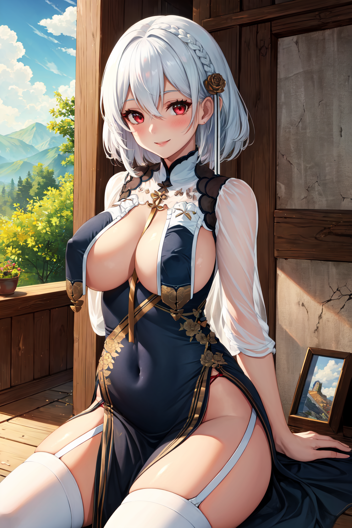 赤い目、白い髪、短い髪、頬の赤み、笑顔、前髪、大きい胸、髪飾り、目の中の髪、おさげ、横おさげ、