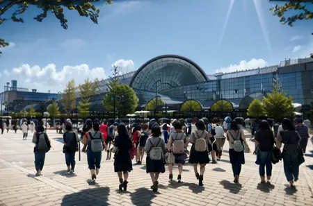 Prompt (In front of INTEX Osaka):intex-osaka, storefront, outdoors, real world location, sunlight, shadow, blue sky, building,