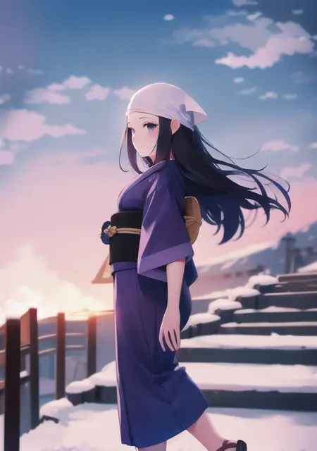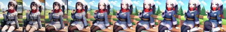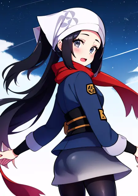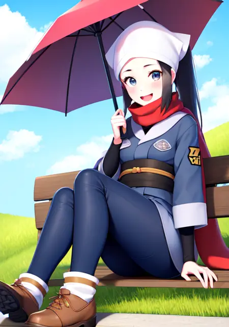 prompt used : akari, 1girl, long hair, looking at viewer, blush, smile, open mouth, skirt, black hair, sitting, jacket, ponytail, :d, pantyhose, sidelocks, outdoors, day, tongue, socks, hand up, scarf, grey eyes, sash, eyelashes, white headwear, umbrella, grass, red scarf, poke ball, grey jacket, logo, bench, oil-paper umbrella, head scarf, loose socks, galaxy expedition team survey corps uniform