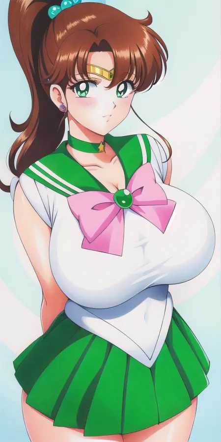 White_leotard_Green_sailor_collar_Green_miniskirt_White_gloves_Green_choker_Pink_bowtie_Pink_back_bow_Circlet_Green_brooch_Short_sleeves: Her sailor jupiter outfit.