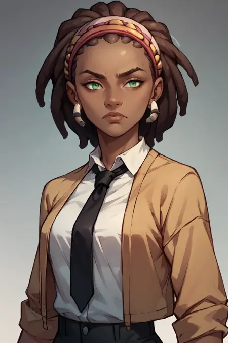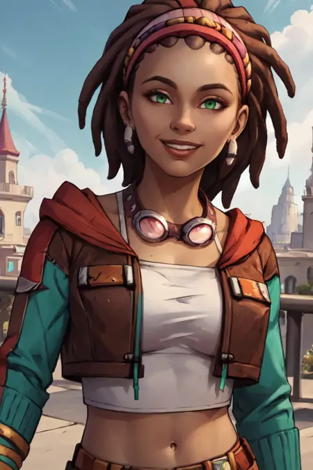 lora:SashaTFTB:0.7 sashatftb, headband, hairband, green eyes, dark skin, 1girl, solo, jewelry, earrings, dark-skinned female, brown hair, dreadlocks, pastoutfit, goggles around neck, midriff, navel, crop top, jacket