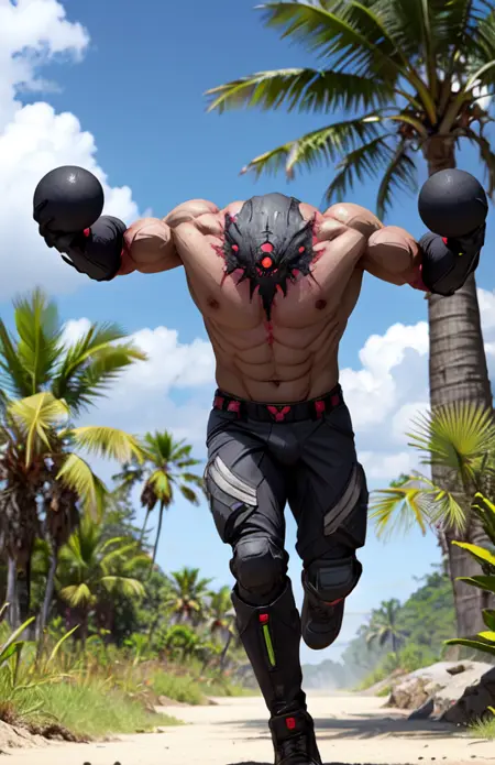 'hkamikaze, headless kamikaze in grass field, raised arms, holding two bombs, shirtless, cargo pants, running'