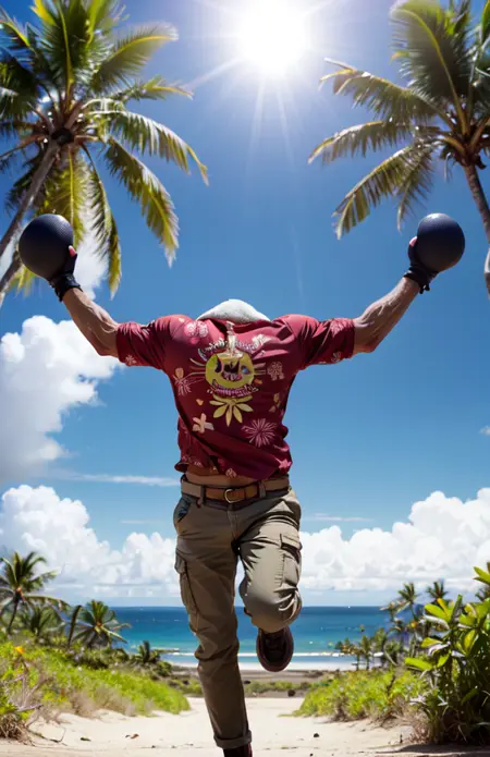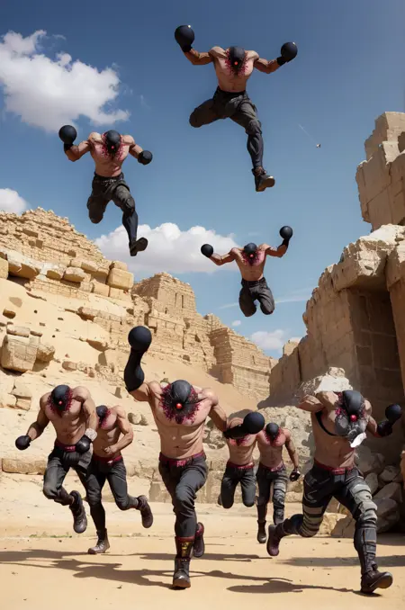 'hkamikaze, 无头神风敢死队在草地上,双臂抬起,手持两枚炸弹,赤膊,工装裤,奔跑'