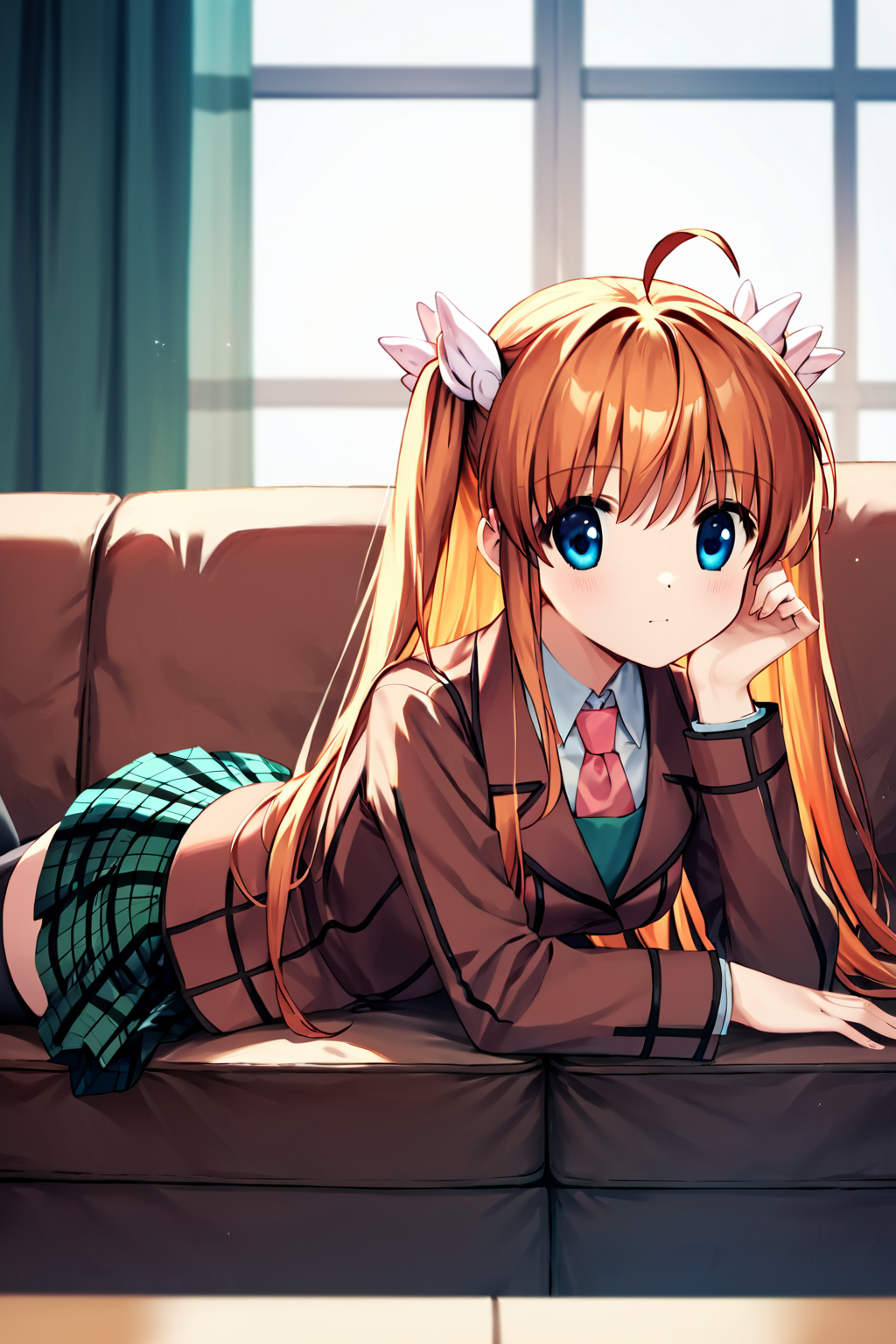 brown blazer, pleated green plaid skirt, black stockings