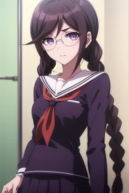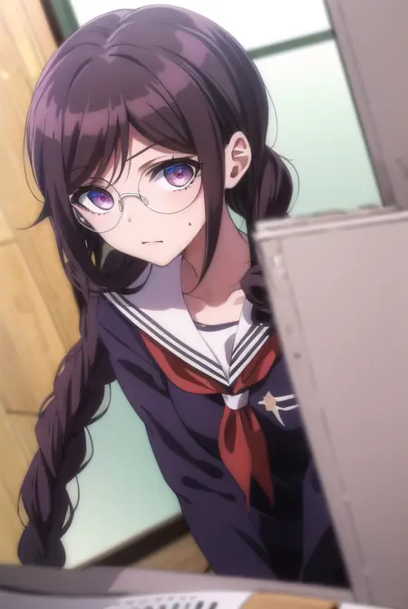fukawa touko、長い髪、前髪、茶色の髪、編み込み、眼鏡、ほくろ、二つ編み、口の下のほくろ、丸いメガネ、(茶色い目:1.3)