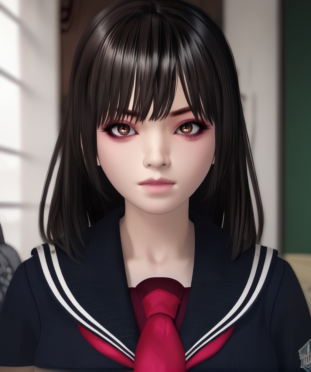 Aya, brown eyes, black hair, bangs,or blunt bangs, long hair,