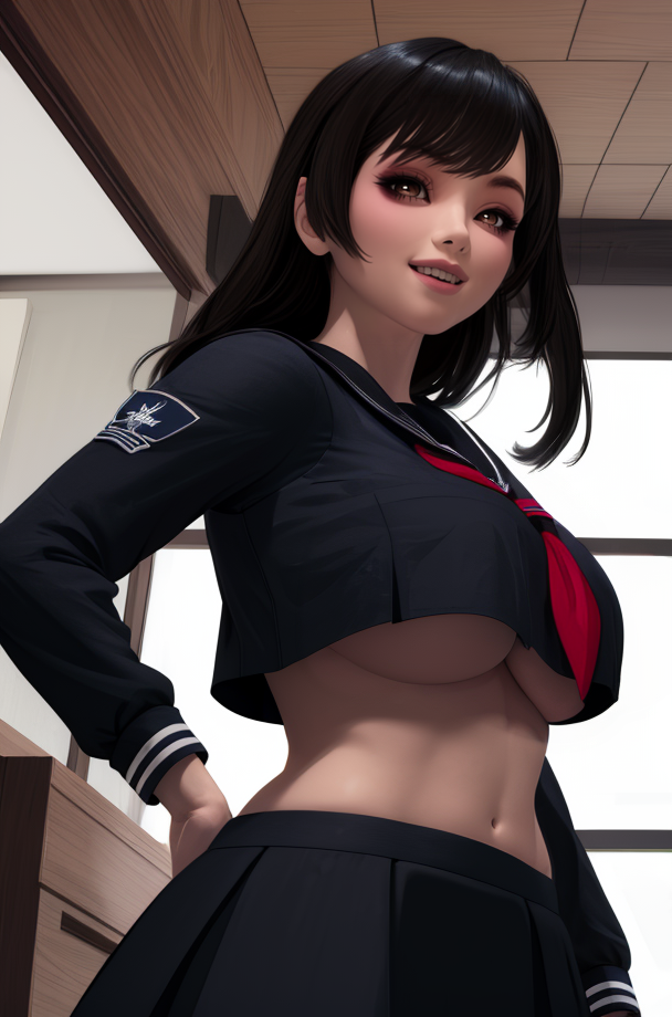 school uniform, = serafuku, blue skirt, or orange shirt, sleeveless, or bare shoulders cleavage, - navel in neg,