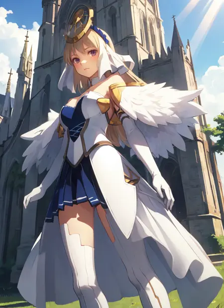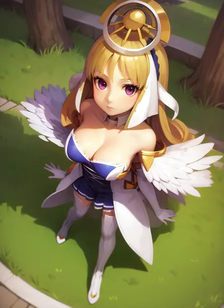 Cloche, one of the main heroines in the second Ar Tonelico game by Gust. Managed to get those winged/feathered ornaments to somehow work (feathered gloves as keyword), but expect weird results the moments her arms move outside of standard poses.