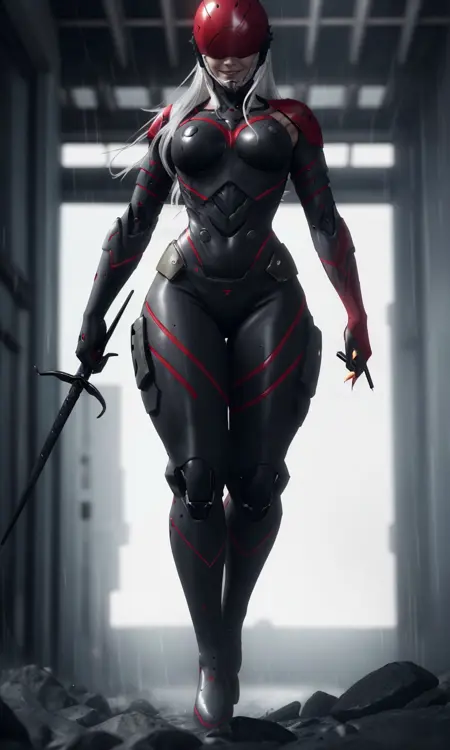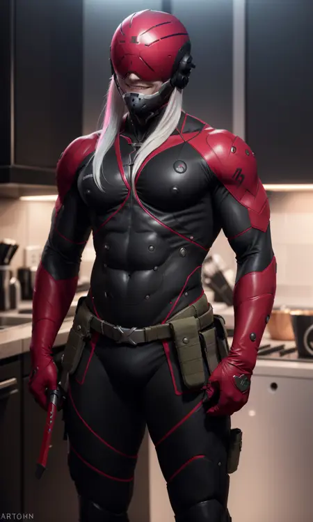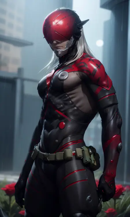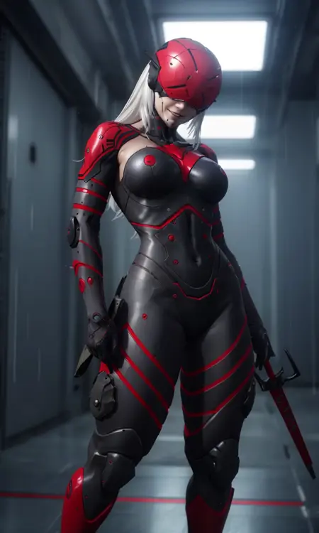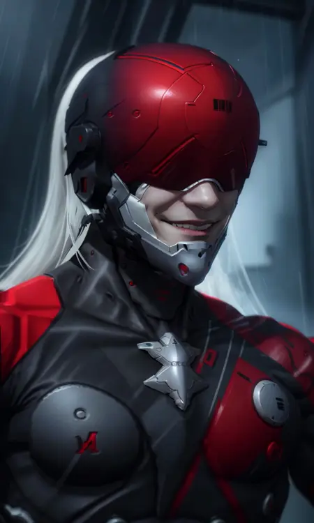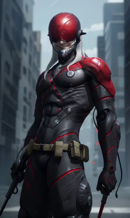 Good prompts to use are cyber ninja, armor, white hair, black and red suit