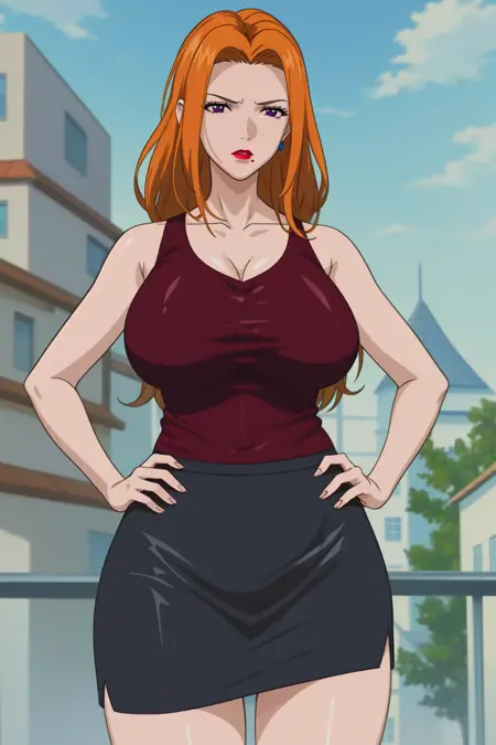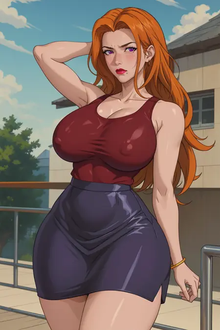 orange hair, long hair, lipstick, purple eyes, jewelry, (mole under mouth:0.8)