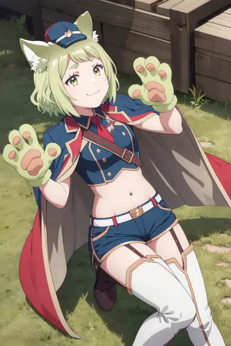 ikenaimiaha,belt,shorts,1girl,solo,jacket,uniform,headwear,cape,animal hands,footwear,thigh boots,:3,