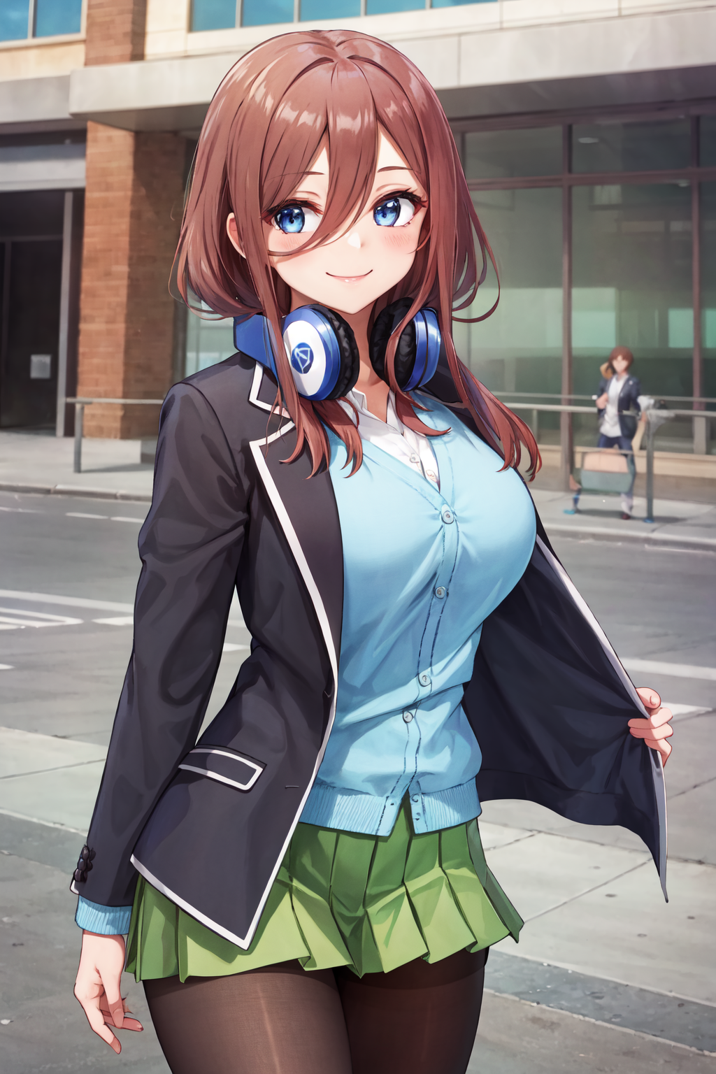- aamiku、長髪、前髪、目の間の髪、首にヘッドホン、大きな胸、制服、ジャケット、(黒いジャケット:1.2)、ブレザー、カーディガン、青いカーディガン、カラーシャツ、白いシャツ、長袖、緑のスカート、レギンス、黒いレギンス、ローファー