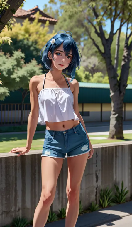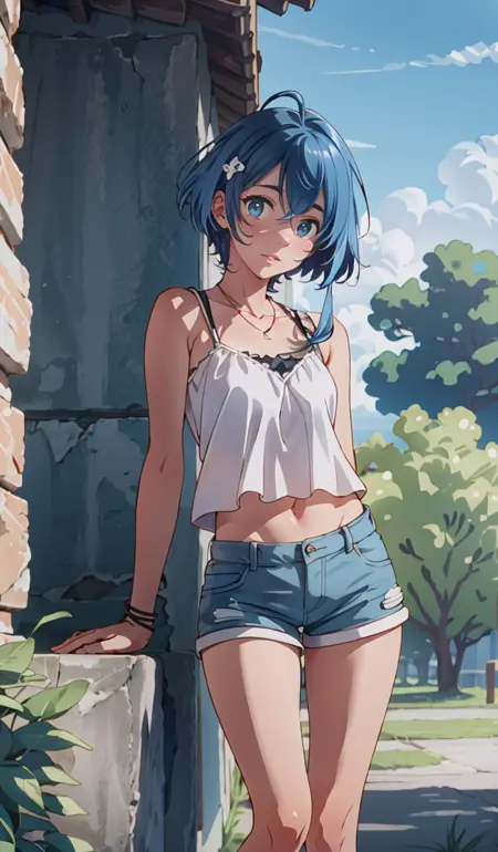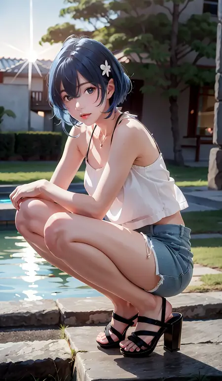 aqwskkr, 1girl, sandals, blue hair, hair ornament, medium length hair, white camisole