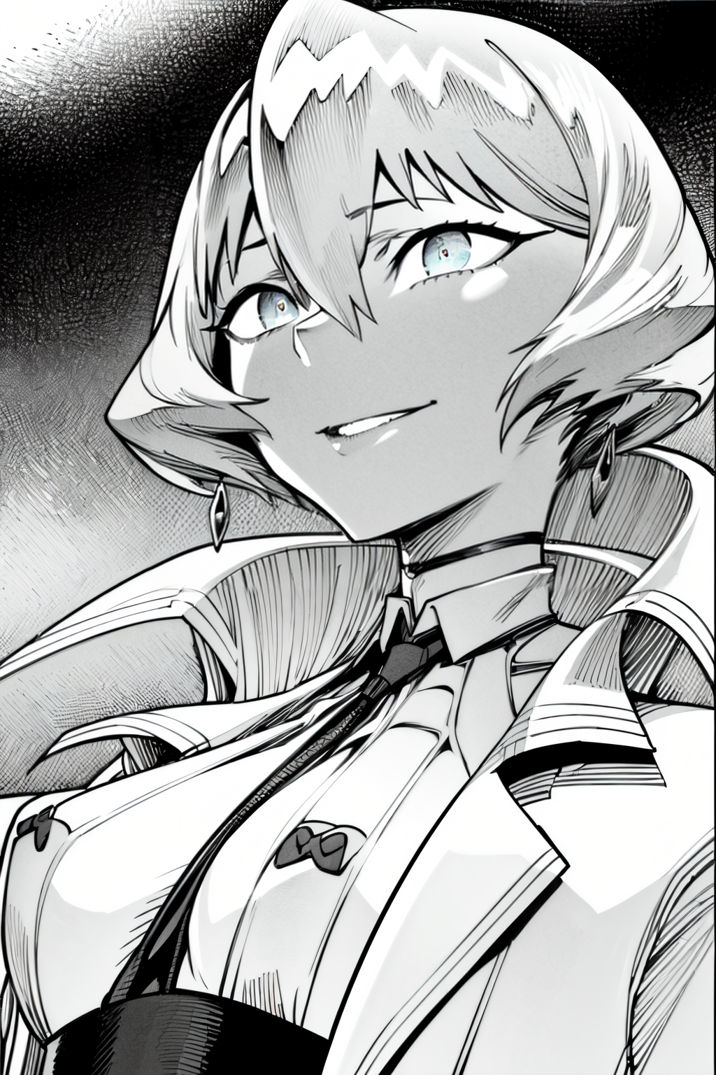 Trigger : finne, short hair, earrings, choker, high collar, coat on shoulders, necktie, dress, cleavage, between breasts, gloves, belt, highleg panties, thigh strap, skindentation, high heels