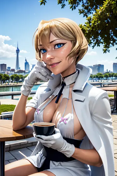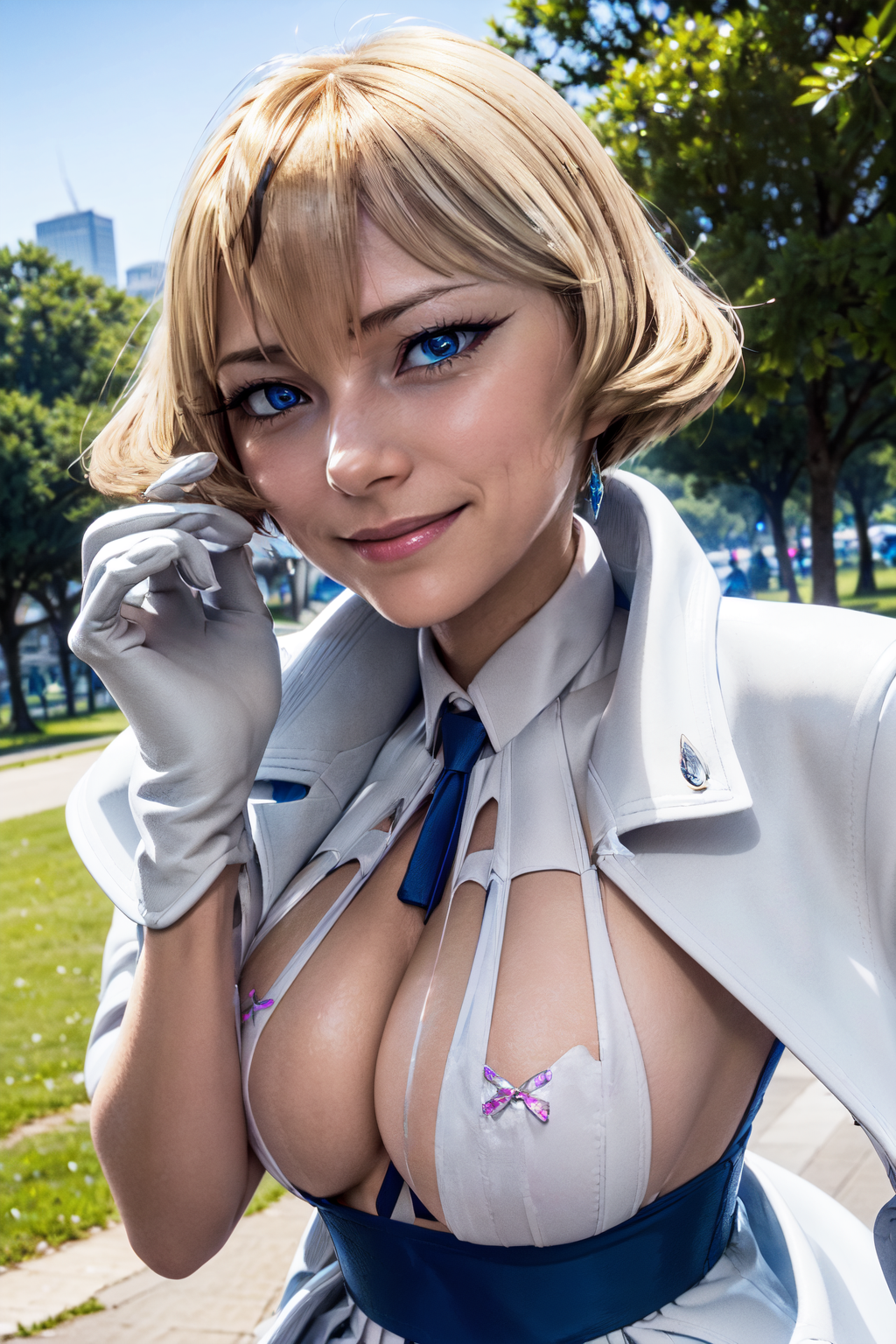 Trigger : finne, short hair, earrings, choker, high collar, coat on shoulders, necktie, dress, cleavage, between breasts, gloves, belt, highleg panties, thigh strap, skindentation, high heels