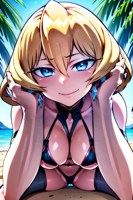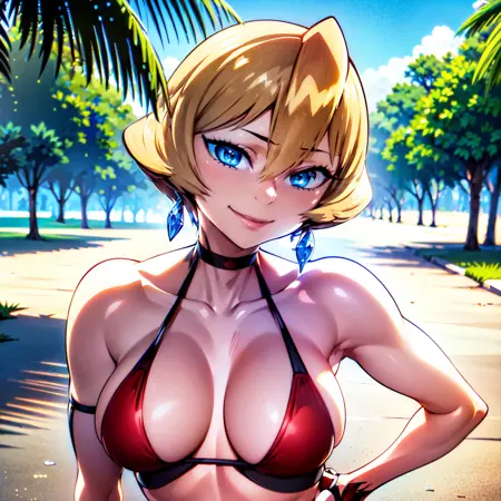 Trigger without Coat : finne, short hair, earrings, choker, bare shoulders, sideboo, necktie, dress, cleavage, between breasts, gloves, belt, highleg panties, thigh strap, skindentation, high heels