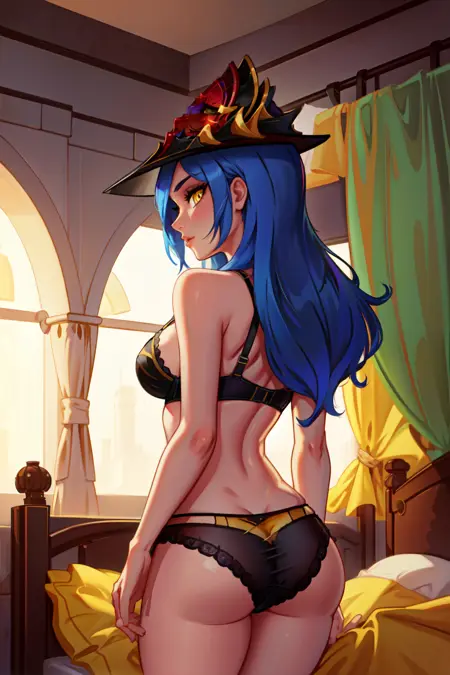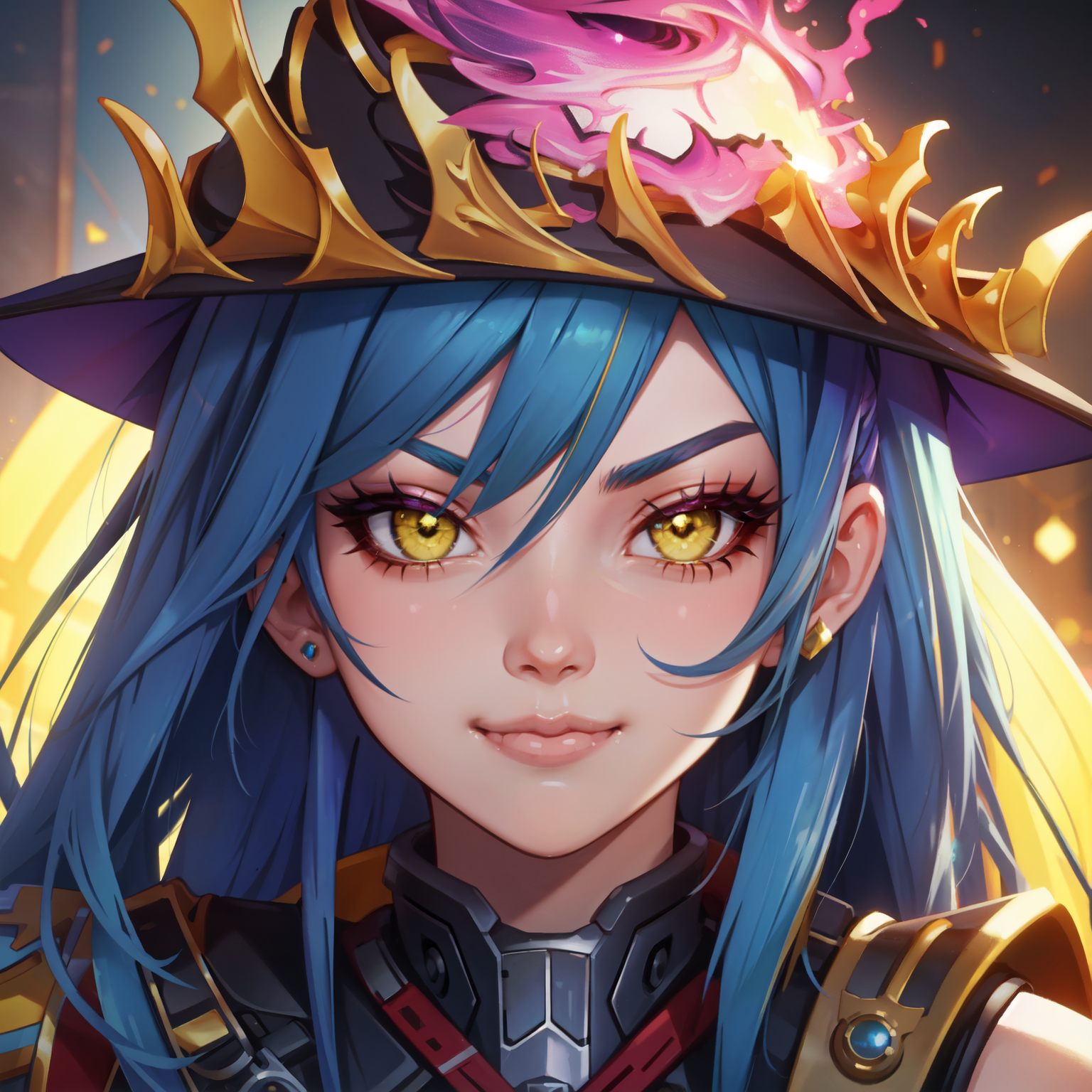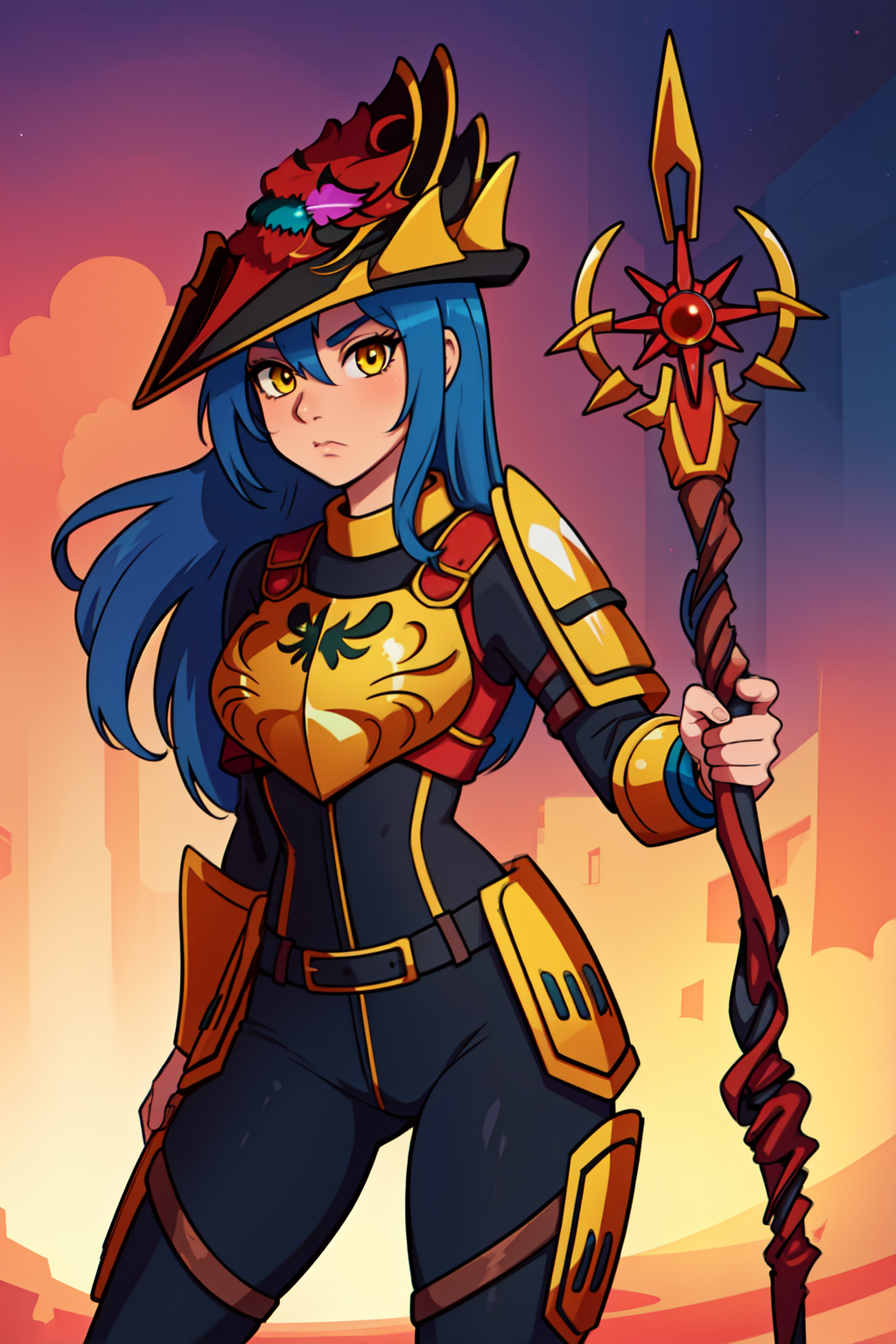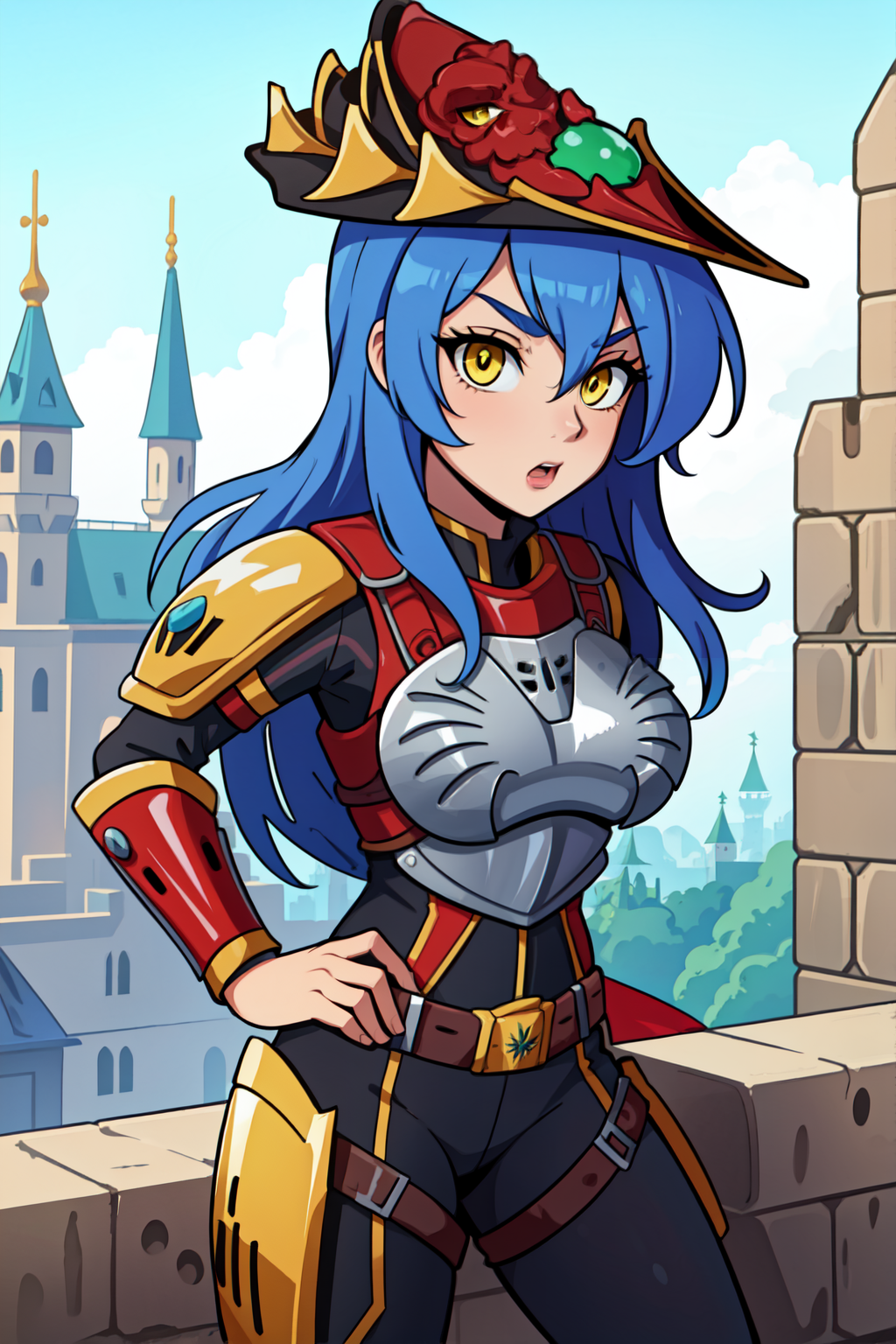 To get her Factory Suit outfit, prompt dang_rs3, blue hair, long hair, yellow eyes, black body suit, breastplate, red armor, hat, fingerless gloves,