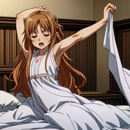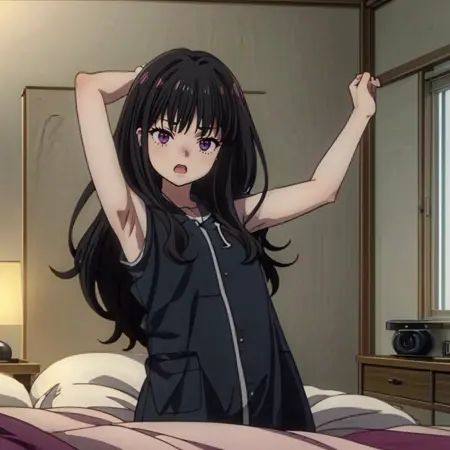 I've Lora-ized a scene of my favorite character waking up. While CivitAI offers play on the bed, there wasn't anything focusing simply on the waking-up part, so I decided to create it. For some reason, DALL-E wouldn't generate an image for me when I requested a scene of a woman waking up, so after tweaking various aspects, I managed to produce a satisfactory waking-up image. It might not be such a rare scene, but I didn't want to struggle with it, so I opted for Lora-ization.